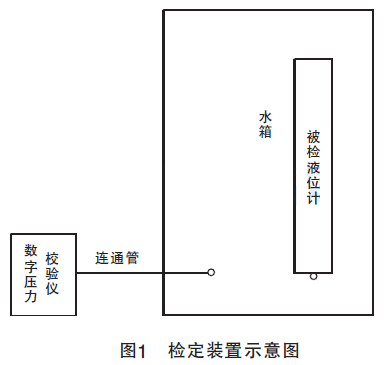 該檢定裝置如圖1所示,包括數(shù)字壓力校驗(yàn)儀、水箱、連通管、水箱、各種液位計(jì)接口和固定裝置。