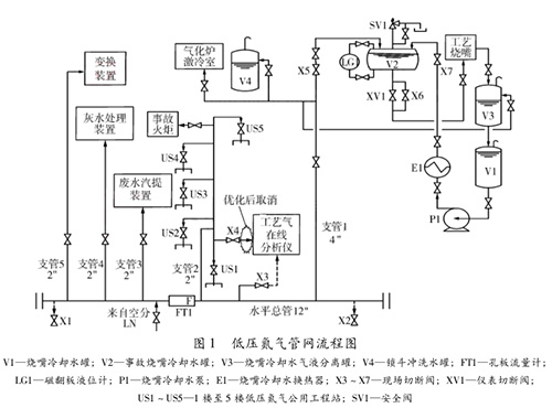 在煤化工領(lǐng)域,氮氣常常用于裝置中易燃易爆、有毒有害可燃性氣體的置換,或作為設(shè)備密封、保壓和儀表檢測元件的保護及動力氣源,對其含水量有較嚴格的要求,一般要求其含水量控制在2×10-6以下。若運行過程中發(fā)生了氮氣管網(wǎng)進水,會給全廠的安全生產(chǎn)造成威脅,冬季時管網(wǎng)甚至會出現(xiàn)結(jié)冰堵塞現(xiàn)象,導(dǎo)致氮氣管網(wǎng)癱瘓;當遇到突發(fā)情況系統(tǒng)需停車時,氮氣無法用于置換等工藝處理,更是會造成較大的安全隱患,甚至會引起設(shè)備損壞、著火、爆炸等惡性事故。因此,分析并解決氮氣管網(wǎng)進水的問題具有重要的意義。