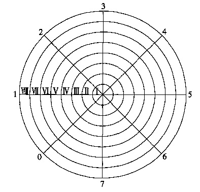 1.2.2 幾何測量法根據(jù)立式金屬罐容量試行檢定規(guī)程,把圓錐體底圓分成M 個同心圓,根據(jù)所分圓環(huán)面積相等條件決定半徑。圓錐體分為一個小圓錐和多個圓臺。在每個圓心圓周測N 個點(diǎn),即測N 個點(diǎn)到罐底中心的高度。底量測量原理見圖2。