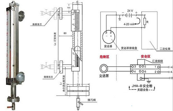 液體液位計是以浮子內(nèi)磁鋼驅(qū)動雙色薄片的翻轉(zhuǎn)來指示液位的一種新型儀表,主體不銹鋼內(nèi)腔管中磁浮子隨液位的升降而上下運動,同時驅(qū)使主體外指示器內(nèi)的雙色薄片翻轉(zhuǎn),有液位時轉(zhuǎn)示紅色、無液位時顯示白色。液體液位計以紅色和白色色帶間的界線即代表液位高度。在指示器左側(cè)配有醒目的刻度標(biāo)尺,從而使液位的指示顯得更加清晰。不僅可以實現(xiàn)現(xiàn)場就地觀測,也可以加裝遠(yuǎn)傳裝置實現(xiàn)遠(yuǎn)程監(jiān)控及報警等功能。