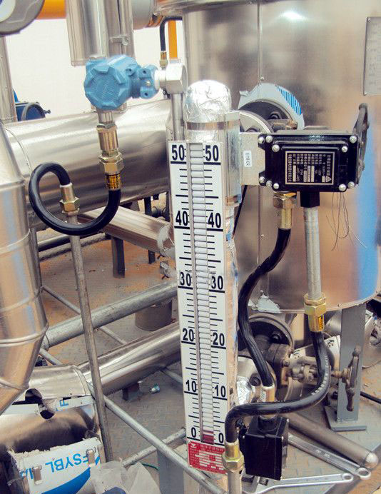 鑒于純水液位計(jì)具有被測介質(zhì)與指示機(jī)構(gòu)完全隔離,密封性能好,防泄漏、適應(yīng)腐蝕條件下的液位測量等優(yōu)點(diǎn),且可靠性高、耐振性能好、結(jié)構(gòu)簡單、安裝方便、維護(hù)費(fèi)用低,現(xiàn)已在電力、石油、化工、冶金、環(huán)保、船舶、建筑、食品等行業(yè)得到廣泛應(yīng)用。本公司用戶上海某公司帶熱壓縮器低溫多效蒸餾海水淡化的濃鹽水、蒸餾水及冷凝水液位測量都采用帶遠(yuǎn)傳的純水液位計(jì)。為了防止結(jié)垢,需在低溫的情況下讓海水達(dá)到沸點(diǎn),要求海水淡化裝置內(nèi)部處于負(fù)壓狀態(tài),正常運(yùn)行時(shí)為-0.093MPa左右,此為用戶純水液位計(jì)使用須達(dá)到的工藝要求,以下說明即為儀表在負(fù)壓狀態(tài)下發(fā)生管路漏氣的典型故障分析情況。