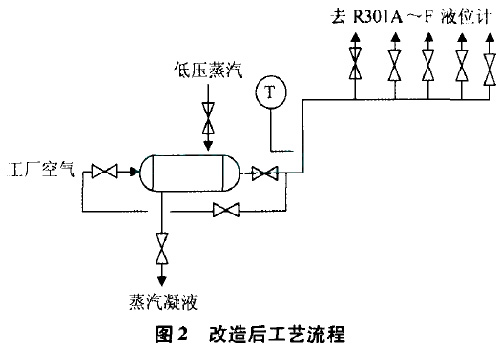 此次試驗(yàn)的成功為徹底解決乙烯球罐磁翻板結(jié)冰提供了寶貴的經(jīng)驗(yàn),因此將試驗(yàn)期間所用的臨時(shí)管線和設(shè)備經(jīng)過(guò)進(jìn)一步完善,于2016年4月底完成全部乙烯球罐(R301A-F)耐酸堿磁翻板液位計(jì)的改造,液位計(jì)上的空氣吹掃管為自制設(shè)備,進(jìn)氣端裝一閥門(mén)用于調(diào)節(jié)空氣量,另一端封閉,在靠進(jìn)液位計(jì)翻板側(cè)每間斷開(kāi)5cm一個(gè)中的孔用于空氣吹掃為保證吹掃空氣的溫度在加熱器出入口增加一旁線,流程見(jiàn)圖2。