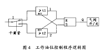 液位計(jì)筒體內(nèi)徑d/~i0mm,標(biāo)尺長(zhǎng)750mm。750mm×20%=150mm,280÷750=37.3%),液位計(jì)油位滯后于貯罐油位變化。液位計(jì)回油時(shí),浮筒漂向管口,則阻尼作用更強(qiáng)了,低油位*限開關(guān)LB/LVL6不能及時(shí)動(dòng)作和關(guān)閉氣閥LB/EV2是造成貯油罐泄空而計(jì)算機(jī)未執(zhí)行油位故障處理程序的原因。圖3 液位計(jì)故障剖析圖3.2 液位檢測(cè)開關(guān)和控制程序干簧管式接近開關(guān)本身依靠磁控開或合,易受周圍磁場(chǎng)干擾產(chǎn)生誤動(dòng)?,F(xiàn)場(chǎng)液位計(jì)安裝位置一側(cè)與電纜橋架相鄰,而另一側(cè)常有行車電磁吸盤吊裝鋼卷作業(yè)。從工作油位控制邏輯過(guò)程可以看出(圖4):盡管油位檢測(cè)開關(guān)已通,每15s(t1=t2=15s)內(nèi),只要存在一次脈沖干擾,開氣閥電路回路將未被選通。反之亦然。因此,干簧管式接近開關(guān)誤動(dòng)產(chǎn)生錯(cuò)誤控制,也是釀成事故的另一個(gè)原因。