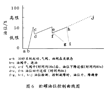 當(dāng)油位在5O%處時(shí),開關(guān)LB/LVL5閉合,計(jì)時(shí)15s,若信號(hào)保持未變,則選通開氣閥,使貯罐油位下降;相反順序關(guān)氣閥,使貯罐油位上升。循環(huán)工作油位控制在5O%位±200mm范圍內(nèi)。