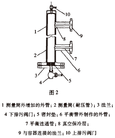 在原有的液位計(jì)結(jié)構(gòu)基礎(chǔ)上,在測(cè)量筒外增加一真空保溫層。由于測(cè)量筒中的液體跟容器中的液體是相同的,故測(cè)量筒外的真空保溫層阻隔了測(cè)量筒內(nèi)的低溫液體與外界空氣的溫度影響。實(shí)踐證明。此項(xiàng)改進(jìn)確實(shí)起到了良好的隔溫作用。但此結(jié)構(gòu)在實(shí)際裝置運(yùn)行中,平衡連通管周圍會(huì)凝結(jié)出大量冰塊。通過分析,由于測(cè)量筒與容器間是通過上下兩根平衡管相連接的,在液位計(jì)可正常指示時(shí),下平衡管中始終充滿低溫液體。因在測(cè)量筒外增加的真空保溫層不能阻隔平衡管與外界的直接接觸,故在平衡管四周還是會(huì)出現(xiàn)大量的冰塊。