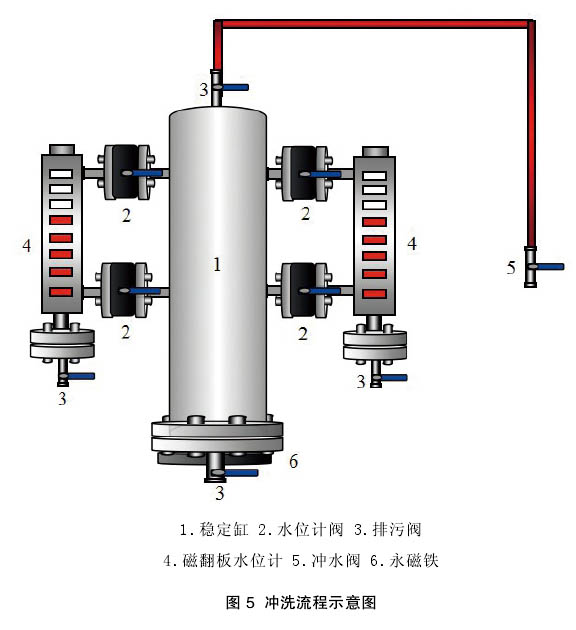 (2)拆下永磁鐵關(guān)閉4個(gè)水位計(jì)閥,打開穩(wěn)定缸上、下閥及閥門5,單獨(dú)沖洗主穩(wěn)定缸。