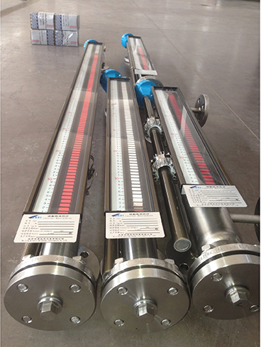 液位計(jì)根據(jù)浮力原理,浮子在測量管內(nèi)隨液位的升降而上下移動,浮子內(nèi)的永久磁鋼通過磁耦合作用,驅(qū)動紅、白色翻柱翻轉(zhuǎn)180’液位上升時(shí),翻柱由白色轉(zhuǎn)為紅色,下降時(shí),翻柱由紅色轉(zhuǎn)為白色,從而實(shí)現(xiàn)液位的指示。