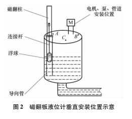 圖 2 中, B 點(diǎn)靠近電機(jī)和泵, 蒸餾水液位計(jì)安裝在此處既影響電機(jī)及泵的檢修, 又因泵附近液位的環(huán)流波動(dòng)較大, 對浮子導(dǎo)向管沖刷嚴(yán)重, 故 B 點(diǎn)不合理; C 點(diǎn)處因有管道通過, 不便維護(hù)且影響管道和泵、 電機(jī)等的起吊更換, 故也不能選擇 C 點(diǎn); A 點(diǎn)遠(yuǎn)離泵和電機(jī), 且有足夠的空間安裝翻板, 便于維護(hù),所以 A 點(diǎn)較為合適。