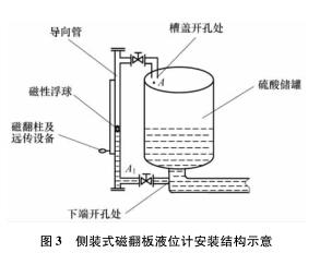 側(cè)面安裝方式的關(guān)鍵點(diǎn)在于: ①酸槽內(nèi)壁襯有瓷磚, 故引流管上開孔應(yīng)選擇槽蓋合適位置, 下孔*好在進(jìn)口管上, 且均需加閥門, 便于維護(hù); ②考慮管內(nèi)硫酸在*端天氣時(shí)對磁翻柱及測量裝置的影響,因本公司循環(huán)槽溫度在75 ℃左右, 為避免夏天溫度過高影響傳感器測量, 冬天防凍, 管徑 D 應(yīng)在 80mm 以上可保證正常測量。