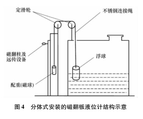 分體式蒸餾水液位計(jì)的安裝步驟如下: ①通過計(jì)算浮力和配重, 在槽體頂部合適位置安裝定滑輪, 在槽外合適位子安裝磁翻板傳感裝置; ②用直徑為 3 mm 的不銹鋼繩連接浮子和配重, 鋼繩長度根據(jù)液位來計(jì)算。這里特別要注意, 磁翻板要反向安裝。