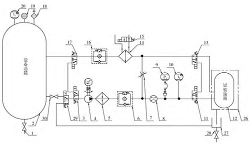 油液供油:原理中油液經(jīng)吸油開關(guān)(30)、L 形三通電動閥(3、29)、油泵(4)、加熱器(5)、供油過濾器(6)、流量計(8)、L 形三 通 電 動 閥(11)后進入被測油箱,然后 經(jīng) L形三通電動閥(13)、油水換熱器(14)、回油過濾器(16)、L 形三通電動閥回到設(shè)備油箱中,此條支路可提供被測油箱剛安裝于試驗臺上時的油液供給,通過流量計軟件計時的方法判斷補油量。