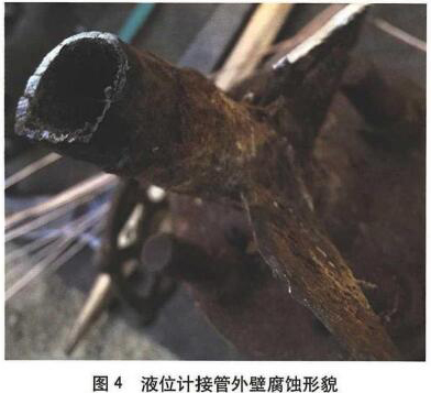 分離罐液位計(jì)接管先于罐體腐蝕泄漏失效是由于管壁較薄加之外表面防腐保溫不完整導(dǎo)致雨水侵人常年腐蝕所致。對此應(yīng)引起設(shè)計(jì)、制造、使用及檢驗(yàn)等相關(guān)各方為戒。