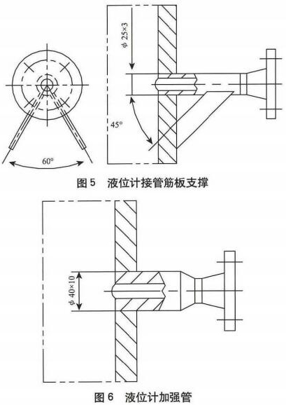 圖5是泄漏襯四氟磁翻板液位計(jì)接管結(jié)構(gòu),雖然必25mmx35mm接管的開孔補(bǔ)強(qiáng)滿足GB150-1989標(biāo)準(zhǔn)[11“開孔不另行補(bǔ)強(qiáng)”的要求,但卻不符合現(xiàn)行標(biāo)準(zhǔn)GB/T150-2011的“開孔不另行補(bǔ)強(qiáng)”要求。因?yàn)椋瑑蓸?biāo)準(zhǔn)雖然限制的設(shè)計(jì)壓力(<2.5MPa)與接管外徑(<89mm)等條件相同,但是后者改版標(biāo)準(zhǔn)卻對接管壁厚及腐蝕裕量增加了要求,這是合理的改進(jìn)完善。對于本例的425mm接管,滿足GB/T150-2011的“開孔不另行補(bǔ)強(qiáng)”條件的管壁厚度至少應(yīng)為5.5mm(按標(biāo)準(zhǔn)規(guī)定當(dāng)腐蝕裕量為1mm時(shí),接管厚度應(yīng)不小于3.5mm)。所以,按HG/T20583-2011對小接管避免彎曲而推薦的加強(qiáng)結(jié)構(gòu)優(yōu)先選用加強(qiáng)管形式建議將液位計(jì)接管更改為圖6的加強(qiáng)管結(jié)構(gòu)。這樣不但解決了小接管的開孔補(bǔ)強(qiáng)和防彎曲加強(qiáng)問題,也可以使小接管的設(shè)計(jì)使用年限與罐體一致,而且便于保證小接管與罐體采用插人式全焊透角焊縫的焊接質(zhì)量。