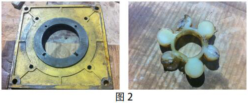 2015 年 9 月 23 日運(yùn)行過程中,02:15 因“機(jī)組高位油箱低油位動作”停機(jī)。現(xiàn)場拆解稀油站 1# 低壓油泵,發(fā)現(xiàn)油泵與底座 2 顆連接螺栓脫落、出油管松脫、底座螺孔拉崩、螺孔周圍多處裂紋、緩沖墊破損等諸多問題。造成油泵無法供油,引起停機(jī)。如圖 2 所示。