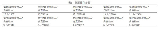 (1)改造前對儲罐的罐體進行了超聲波測厚以及材料的化學(xué)成分及性能分析,其材質(zhì)滿足現(xiàn)行的使用條件,其儲罐的罐體參數(shù)及每層罐壁的厚度(實測)見表1,罐壁的每層壁板高度為1690mm,其搭接寬度為40mm,縱焊縫為對接結(jié)構(gòu),見表1。