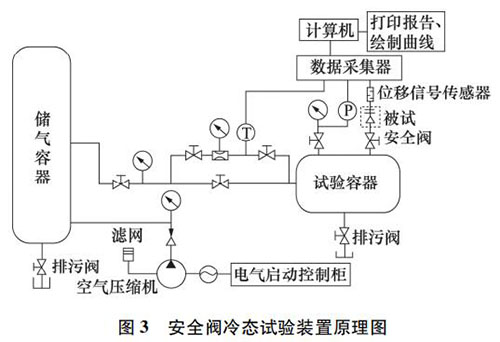 安全閥冷態(tài)試驗(yàn)裝置( 見圖 3) 主要由壓縮氣源、儲氣罐、節(jié)流控制閥、試驗(yàn)罐、閥門和管道、數(shù)據(jù)采集系統(tǒng)、控制系統(tǒng)等組成,可對公稱壓力 PN≤20 MPa,公稱通徑 DN≤150 mm 的安全閥進(jìn)行整定壓力試驗(yàn)、排放壓力試驗(yàn)、回座壓力試驗(yàn)、開啟高度試驗(yàn)、排量及排量系數(shù)試驗(yàn),檢測參數(shù)和自動(dòng)化程度達(dá)到國內(nèi)**水平。