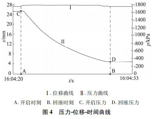 運(yùn)用安全閥冷態(tài)試驗(yàn)裝置對該苯酚液位計(jì)進(jìn)行動(dòng)作性能試驗(yàn),將試驗(yàn)容器內(nèi)的介質(zhì)壓力卸放到整定壓力以下,開啟試驗(yàn)容器和安全閥進(jìn)口端的球閥,關(guān)閉流量計(jì)管路閥門,開啟主測試管路截止閥,開啟儲氣容器通向試驗(yàn)容器的節(jié)流閥,逐漸加壓,同時(shí)啟動(dòng)計(jì)算機(jī)數(shù)據(jù)采集系統(tǒng),被試安全閥開啟,繼續(xù)升高壓力,直至被試安全閥保持全開啟( 排放) 狀態(tài),然后關(guān)閉儲氣容器通向試驗(yàn)容器的閥門,被試安全閥亦逐漸關(guān)閉。計(jì)算機(jī)自動(dòng)生成試驗(yàn)過程的壓力、位移曲線,試驗(yàn)人員記錄采集開啟壓力、排放壓力、回座壓力、開啟高度等數(shù)據(jù)。重復(fù)上述試驗(yàn)至少 3 次,得到相應(yīng)壓力-位移-時(shí)間曲線,見圖 4。左縱坐標(biāo)為位置,右縱坐標(biāo)為壓力,其中上部曲線代表導(dǎo)閥位移,下部曲線代表壓力變化。當(dāng)導(dǎo)閥位置發(fā)生變化,代表導(dǎo)閥開始開啟動(dòng)作,此時(shí)的壓力為該苯酚液位計(jì)的開啟壓力,即整定壓力; 當(dāng)導(dǎo)閥位置回到原點(diǎn)代表導(dǎo)閥已經(jīng)回座,此時(shí)對應(yīng)的壓力即為回座壓力。