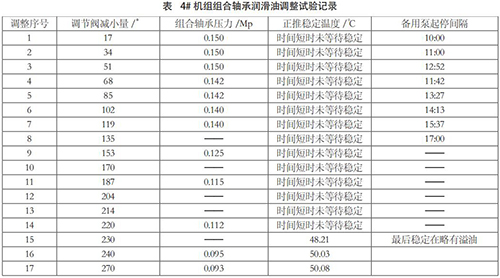 通過(guò)調(diào)整組合軸承供油管調(diào)節(jié)閥,在環(huán)境溫度*高月份和單冷卻器工作條件下,機(jī)組滿負(fù)荷時(shí)的推力軸承*高溫度為 50.08℃,滿足合同要求和**相關(guān)規(guī)范要求,實(shí)現(xiàn)了低壓油泵一主一備運(yùn)行方式,滿足機(jī)組安全運(yùn)行要求。