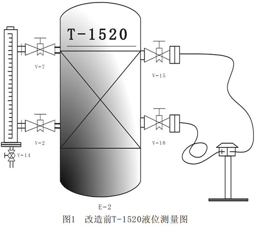 原T-1520液位測量為下圖1所示,左側為醋酸液位計,右側為雙法蘭磁性浮子液位計。
