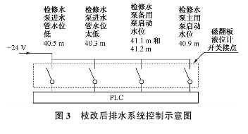 它結(jié)構(gòu)是利用旁通管的原理,主導(dǎo)管內(nèi)的液位和尾水管內(nèi)的液位高度一致,根據(jù)阿基米德定理,磁性浮子在液體中產(chǎn)生的浮力和重力平衡,當(dāng)尾水管中的水位升降時(shí),液位計(jì)主導(dǎo)管內(nèi)的浮子也隨之升降,浮子內(nèi)的永久磁鐵通過磁耦合驅(qū)動(dòng)指示器內(nèi)的翻板指示器,當(dāng)液位上升或下降時(shí),翻板指示器由白色翻轉(zhuǎn)為紅色,或由原來的紅色翻轉(zhuǎn)為白色,指示器的顏色改變的高度就是被測水位的實(shí)際高度,從而實(shí)現(xiàn)液位的現(xiàn)場指示,以供運(yùn)行人員目測尾水管的實(shí)時(shí)水位。安裝于液位計(jì)管壁外側(cè)的磁記憶開關(guān),可多點(diǎn)設(shè)置、滑動(dòng)調(diào)整位置,提供了液位開關(guān)量報(bào)警功能。在裝置的頂部安裝了一個(gè)自動(dòng)排氣裝置,當(dāng)主導(dǎo)管內(nèi)液位上升時(shí)能夠自動(dòng)的排氣,下降時(shí)能夠按時(shí)補(bǔ)氣?,F(xiàn)場安裝耐高溫磁翻板液位計(jì)時(shí),裝置標(biāo)尺的0位,對應(yīng)的實(shí)地高程為EL.40.0m。浮子開關(guān)設(shè)定5個(gè)水位動(dòng)作值,檢修水位低開關(guān)量報(bào)警值對應(yīng)的高程為40.3m;停止所有檢修水泵的開關(guān)量,所對應(yīng)的高程為40.5m;啟動(dòng)主用檢修水泵的開關(guān)量,所對應(yīng)的高程為40.9m;啟動(dòng)檢修水泵主用泵的開關(guān)量,以及要求手動(dòng)啟動(dòng)大泵,并作為水位高報(bào)警上送上位機(jī),所對應(yīng)的高程為41.1m與41.2m,兩個(gè)開關(guān)量并列接入。全部開關(guān)量分別送入PLC,如圖3所示。