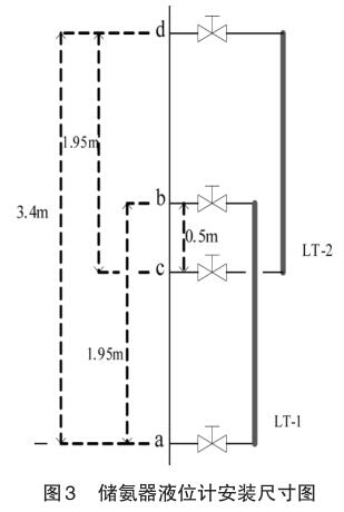 如圖 3 液位計(jì) LT-1 的液相 a 和氣相 b 的距離為1.95m;液位計(jì)LT-2的液相c和氣相d的距離為 1.95m;LT-1 液位的氣相口 b 和 LT-2 液位的液相口 c 的距離為 0.5m;當(dāng) LT-1 實(shí)際液位到達(dá)LT-2液位的液相口c位時(shí),LT-1液位計(jì)的信號(hào)不輸出,將由上部液位計(jì) LT-2 來顯示工作,信號(hào)也有LT-2液位計(jì)*終輸出。