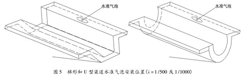 為便于直接確定渠道比降,定型斷面在工廠制作時,在渠道堤頂安裝水準(zhǔn)氣泡,當(dāng)水準(zhǔn)氣泡居中時,設(shè)定的定型渠道斷面比降即為 1/500 或 1/1000時,不需再進(jìn)行渠槽斷面參數(shù)的現(xiàn)場率定,通過量測定型斷面渠道水深,即可求得過水流量。圖 5 為設(shè)置水準(zhǔn)氣泡的梯形渠道定型斷面和 U 型渠道定型斷面示意圖。