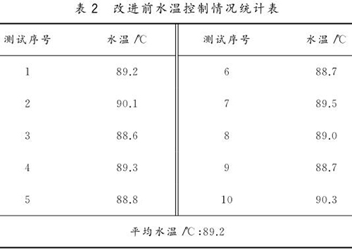 根據(jù)生產(chǎn)標(biāo)準(zhǔn)設(shè)定水溫為85℃,進(jìn)行了10次測試,平均水溫為89.2℃(見表2),超出了設(shè)定溫度4.2℃。