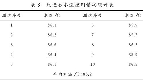 熱水裝置改進(jìn)完成后,*大地降低了由其引發(fā)的設(shè)備故障,到目前為止未發(fā)生一次設(shè)備故障;降低了加熱元件工作時(shí)水箱的震動(dòng)和噪聲;提高了水溫的控制精度。在設(shè)定水溫為85℃情況下,進(jìn)行了10次測試,平均水溫為86.2℃(表3),水溫的波動(dòng)情況由改進(jìn)前4.2℃降低到1.2℃。