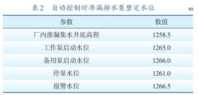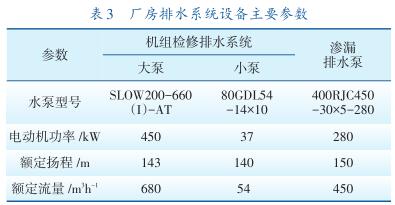 呼蓄電站廠房排水系統(tǒng)包括地下廠房滲漏排水系統(tǒng)、機(jī)組檢修排水系統(tǒng)。地下廠房滲漏排水系統(tǒng)設(shè)有1個滲漏集水井,有效容積364 m 3 ,設(shè)5臺滲漏排水泵,3運(yùn)2備,系統(tǒng)*大滲漏總排水量為2250m 3 /h。滲漏排水泵正常運(yùn)行時由廠內(nèi)滲漏排水控制盤PLC或監(jiān)控系統(tǒng)自動控制啟停,也可就地通過每臺泵的啟動柜手動啟停。自動控制時整定水位見表2。廠房排水系統(tǒng)設(shè)備主要參數(shù)見表3。