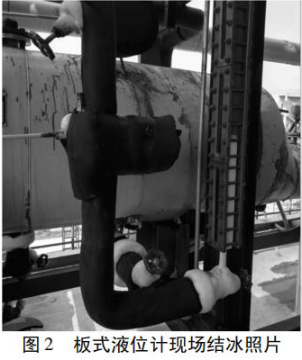 制冷系統(tǒng)調(diào)試運行時,發(fā)現(xiàn)防霜磁翻板液位計的底部開始有氨氣泡形成,徐徐上升到液面消失,并且液面上下浮動,幅度較大,不能穩(wěn)定在某一位置內(nèi)。隨著系統(tǒng)的運行,液位計的下部開始結露、結霜,結霜高度逐漸增加,并由霜轉化為冰,無法觀察到液位,見圖 2。同時,螺桿式制冷壓縮機出現(xiàn)了“潮車”現(xiàn)象。由于操作者無法判斷液位的準確位置,為防止事故發(fā)生,被迫停機,嚴重影響了物料的生產(chǎn)。