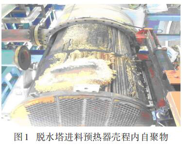 (1)脫水塔進(jìn)料熱交換器和塔頂冷凝器內(nèi)生成大量自聚物的主要原因是浮頭式換熱器結(jié)構(gòu)復(fù)雜,設(shè)備死角多;丁二烯走殼程,流速慢,會使丁二烯在高溫環(huán)境下停留過長,發(fā)生自由基聚合反應(yīng)。解決辦法是將 2 臺換熱器由浮頭式改為固定管板式換熱器,并將丁二烯含量較高的塔頂氣改為管程。一方面換熱器結(jié)構(gòu)較為簡單無死角;另一方面走管程流速快,減少了丁二烯停留時間。