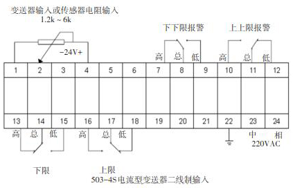報警控制:面板有上限(H)、上上限(HH)或下限(L)、下下限(LL)報警燈及對應(yīng)的輸出繼電器。當(dāng)顯示值高于或低于用戶設(shè)定的上限、上上限或下限、下下限值時,對應(yīng)的報警燈閃爍顯示,且對應(yīng)的繼電器接點狀態(tài)改變,同時伴有表內(nèi)蜂鳴器報警聲響。
