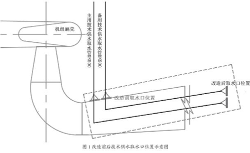 (3)對下游電站技術(shù)供水取水口進(jìn)行調(diào)整,將技術(shù)供水取水管向尾水管擴(kuò)散段側(cè)面下游方向延伸 33 m,將取水口升高 3 m,并在取水口加裝過濾網(wǎng),以過濾較大的砂石、木塊等,減少對磁翻板液位計(jì)、濾水器等的沖擊磨損和堵塞。改造前后的技術(shù)供水取水口示意圖如圖 1 所示。