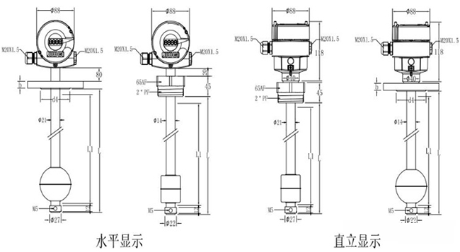 為更直觀地給用戶展現(xiàn)不銹鋼浮球液位計的規(guī)格,請參考兩種不銹鋼浮球液位計水平顯示以及直立顯示的不同規(guī)格尺寸,如下圖所示: