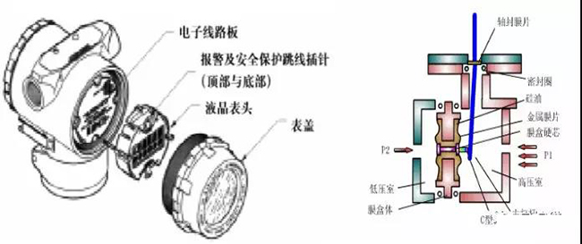 鍋爐差壓式液位計結(jié)構(gòu):主要部件為傳感器模塊、電子元件外殼、毛細管、高低壓側(cè)法蘭及膜片。傳感器模塊包括充油傳感器系統(tǒng)(隔離膜、充油系統(tǒng)和傳感器)以及傳感器電子元件。