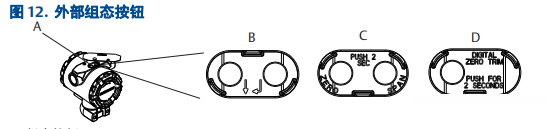 使用位于頂部銘*下、三組可能的外部組態(tài)按鈕中某一組進(jìn)行零點(diǎn)調(diào)校。為了操作組態(tài)按鈕,需要松開(kāi)螺釘,滑動(dòng)變送器頂部的銘*。參照?qǐng)D 10 來(lái)確認(rèn)功能。