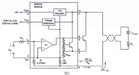 把傳感器輸出的不同電壓轉換成標準的4-20ma輸出,可采用不同的電路形式。成本低的可采用分立器件,但是為了達到比較高的精度,要保證相應器件的匹配程度,調(diào)試也比較麻煩。傳感器專用的4-20ma 的一體化變送器集成電路,采用該系列產(chǎn)品設計的變送器成本低,精度高,調(diào)試簡單。經(jīng)過選擇決定使用完成設計。內(nèi)部結構如圖三: