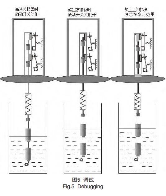 3)在調(diào)試過程中,發(fā)現(xiàn)液位開關(guān)沒有自保持功能,當(dāng)高報警點過后,液位再往上升則高液位報警會消除,低液位時也是同樣,在分析原因后發(fā)現(xiàn),鐵芯在套筒內(nèi)移動的位置不當(dāng)是造成不能自保持的原因,如圖5所示,于是在套筒內(nèi)的鐵芯上方加一阻擋塊,使高液位超出時,鐵芯被阻擋塊擋住,不再向上移動,從而不會脫出微動開關(guān)的磁力范圍,對低液位報警的自保持是在鐵芯的下部加一個環(huán)型的墊片,阻止鐵芯向下移動超出微動開關(guān)的磁力范圍。從而提高了可靠性和重復(fù)性。接下來的調(diào)試中,又出現(xiàn)了一些零零碎碎的問題,如磁鐵磁性不夠,或者彈簧彈性不夠,彈簧的抗疲勞性差。元器件的材料和加工工藝不理想,出于對核電的安全性和穩(wěn)定性的考慮,開始考慮使用國外公司的產(chǎn)品,在試用后沒有出現(xiàn)以上的問題,于是決定從新采購一批國外的液位開關(guān),將有問題的液位開關(guān)更換成國外的產(chǎn)品。