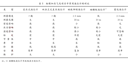 目前在粉煤加壓氣化項目中常采用的液位計類型主要有:差壓式液位計、雙法蘭式差壓液位計、磁致伸縮液位計、磁翻板液位計、雷達液位計等。這幾種液位計各有特色,都存在著一定的優(yōu)勢與不足,性能對比結果見表1所列。