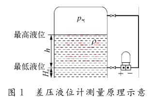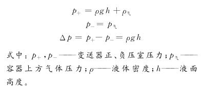 在粉煤加壓氣化工藝流程中,冷卻水、冷凝水是干凈潔凈的介質,測量該介質的液位如無特殊情況,選用普通的差壓式液位計即可。差壓式液位計是利用流體靜力學原理,通過測量流體的壓差來計算出液位的高低,其測量原理如圖1所示。這種方法簡捷、方便,但是準確度與穩(wěn)定性不高,而且測量結果受到介質密度的影響,為滿足測量精度常需要進行補償或采用組合式儀表測量方案。
