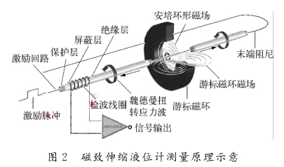 這樣的選型設計,雖然能夠滿足測量準確度的要求,但相應增加了購置成本,并且根據項目應用的實際反饋,現場存在泄漏點多、安裝與維護較復雜等問題。因此在新的伊泰杭錦旗項目中,由于項目所在地的晝夜溫差較大,冬季環(huán)境溫度*低,改用側裝3臺磁致伸縮式液位計并配磁翻柱顯示器來替代原先的差壓式測量方案。磁致伸縮式液位計主要依據磁致伸縮原理而工作,工作原理如圖2所示,由傳感器電路沿磁致伸縮線(波導絲)發(fā)出電流脈沖,在磁致伸縮線周圍形成環(huán)形磁場,當其與浮子內的永磁鐵產生的縱向磁場發(fā)生疊加時,會在浮子位置產生1個扭轉脈沖回傳至傳感器的探頭。測量起始脈沖與返回脈沖的時間差來確定浮子的位置,即液面的位置。磁致伸縮液位計具有精度高、使用壽命長、無需調零校準、易維護、安全性高等優(yōu)點,但是在安裝時要注意:探測桿要保證垂直,不能折彎;做好接地屏蔽工作,以免電磁干擾影響測量效果。