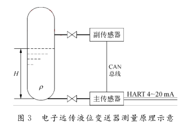 c)對膜片的材質要求較高。為防止腐蝕與氫脆現象,需要選用316L鍍金膜片,成本較高。同時由于介質的易沉積性,在加裝沖洗吹掃裝置后,仍然需要定期清理更換膜片,以保證測量精度。2)改進的電子遠傳液位變送器。在后續(xù)的項目中采用改進的電子遠傳液位變送器,其測量原理如圖3所示。該種電子遠傳液位變送器取消了傳統(tǒng)的毛細管引壓方式,使用主、副2個壓力傳感器,分別安裝于容器的底部與上方,用來測量高低壓側的壓力。2個壓力傳感器以CAN總線的方式連接到一起,并且將副傳感器接收到的壓力信號傳至主傳感器中進行差壓計算,計算完成后轉換成標準的4~20mA信號輸出。