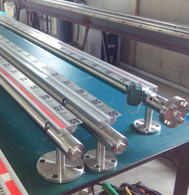 在浮子液位計上安裝變送器,通過浮子上下移動,經磁耦合作用使導桿內測量元件依次動作,獲得電阻信號變化,轉換成0~10mA或4~20mA的標準信號輸出,與顯示儀表或計算機連接,達到遠傳目的。