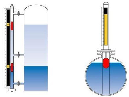 液位計根據(jù)浮力原理,浮子在測量管內(nèi)隨液位的升降而上下移動,浮子內(nèi)的永久磁鋼通過磁耦合作用,驅(qū)動紅、白色翻柱翻轉(zhuǎn)180’液位上升時,翻柱由白色轉(zhuǎn)為紅色,下降時,翻柱由紅色轉(zhuǎn)為白色,從而實(shí)現(xiàn)液位的指示。